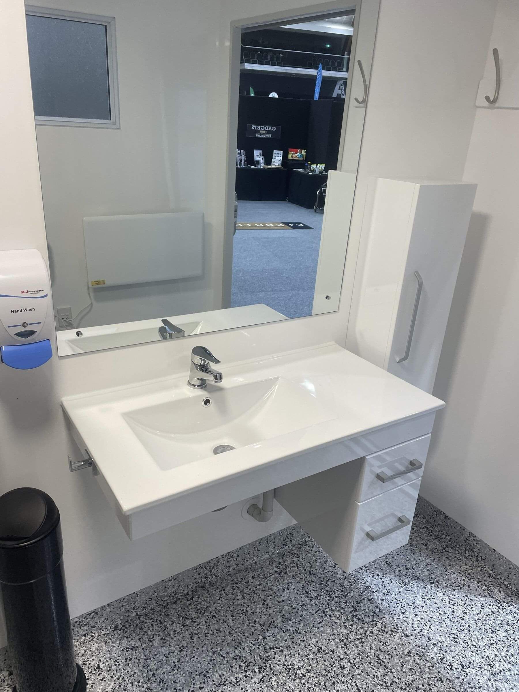 All our mobile bathrooms are complete with a disability height toilet and a handrail, handrails in the shower, and adjustable hand basins for standing or wheelchair height.
